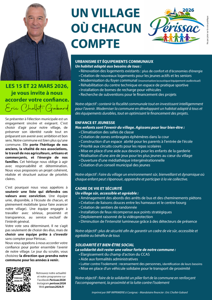 📍 Ensemble, continuons à construire l’avenir de Périssac, un village où chacun compte.